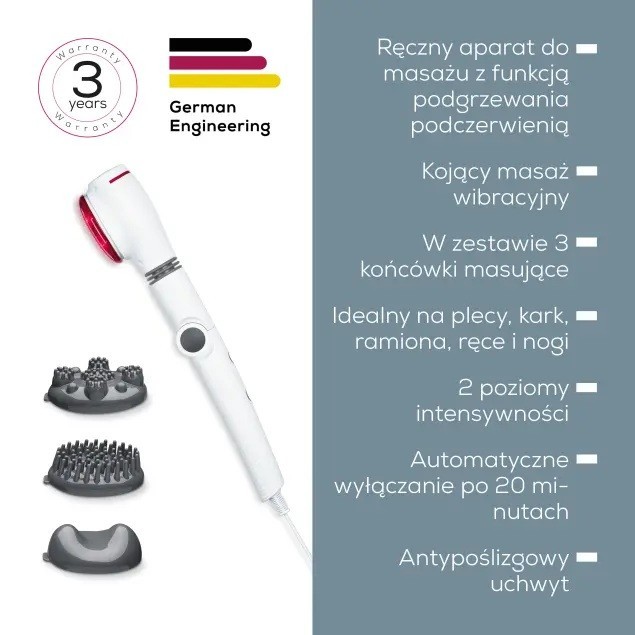 - 3 wysokiej jakości końcówki masujące umożliwiają indywidualne zastosowanie