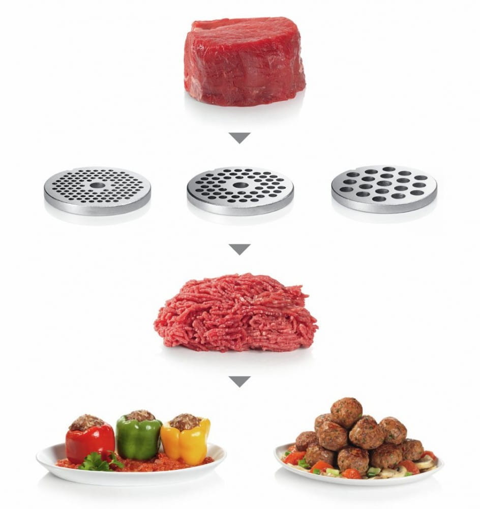 - Funkcjonalność maszynki (ponad 10 funkcji) pozwala mielić mięso i rybę, ale również rozdrabniać warzywa, owoce, sery i inne
