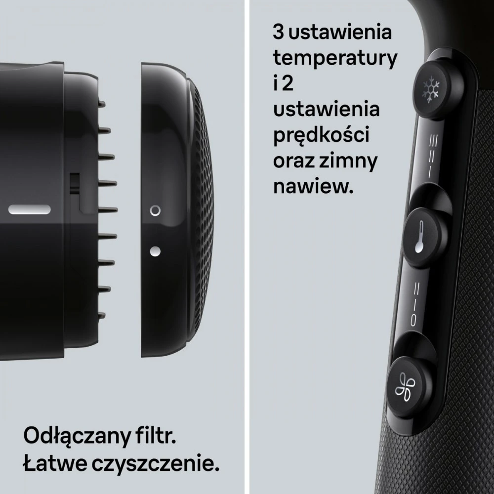 Pozostałe parametry: Łatwe w obsłudze przełączniki suwakowe 3 ustawienia temperatury Osłona obrotowa ułatwiająca przechowywanie przewodu Dysza koncentratora Dyfuzor do loków Wyjmowany tylny filtr Szczotka czyszcząca