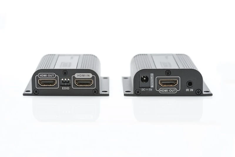 Zestaw przedłużacza Digitus HDMI, Full HD to rozwiązanie do przedłużania sygnału wideo do 50 m spełniające najwyższe wymagania. Przesyła cyfrowe sygnały wideo i audio na maksymalną długość do 50 m. Najwyższa obsługiwana rozdzielczość wideo to 1080p/60Hz. Na jednostce nadajnika znajduje się przełącznik EDID-Switch, dzięki któremu można regulować rozdzielczość oraz format audio sygnału wyjściowego. Na nadajniku znajduje się również port HDMI Loop Out, który umożliwia podłączenie lokalnego monitora. Dzięki obsłudze kabla PoC (power over cable) jednostka nadajnika musi jednak posiadać zasilanie elektryczne. W zestawie znajdują się dwa dwukierunkowe moduły na podczerwień (nadajnik, odbiornik), poprzez które można za pomocą pilota zdalnie sterować podłączonym źródłem sygnału wejściowego.