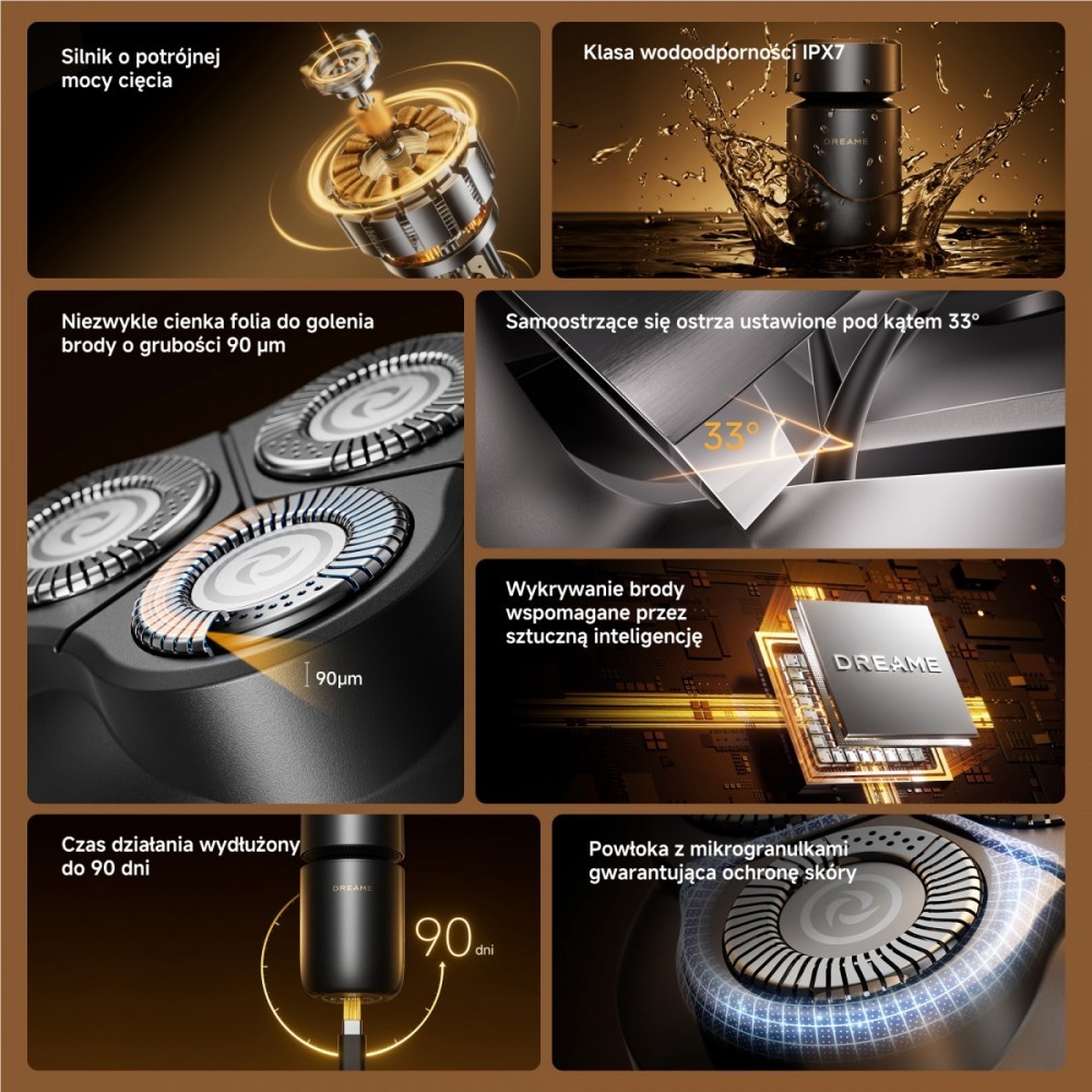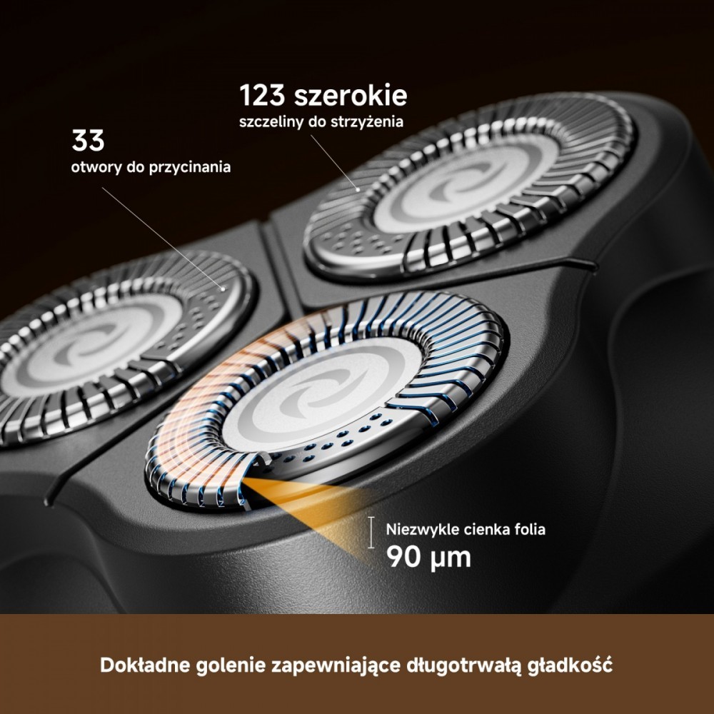Golarka uniwersalna Dreame S7 łączy w sobie cztery zaawansowane technologie golenia, umożliwiając gładkie i precyzyjne golenie niezależne od rodzaju brody. Silnik wysokoobrotowy w połączeniu z algorytmem sztucznej inteligencji i regulacją mocy w czasie rzeczywistym zapewnia skuteczne golenie bez konieczności wielokrotnego przesuwania maszynki. Wyjątkowo cienka folia o grubości 90 mikrometrów w połączeniu z samoostrzącymi się ostrzami ustawionymi pod kątem 33 stopni pozwala chwycić i przyciąć włosy o dowolnej długości i grubości z wyjątkową precyzją.