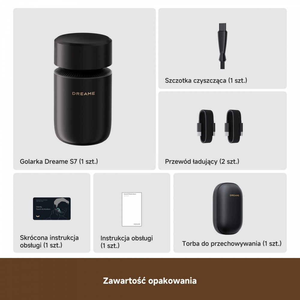 Akcesoria w zestawie: Szczotka czyszcząca Przewód ładujący Torba do przechowywania Skrócona instrukcja obsługi Instrukcja obsługi