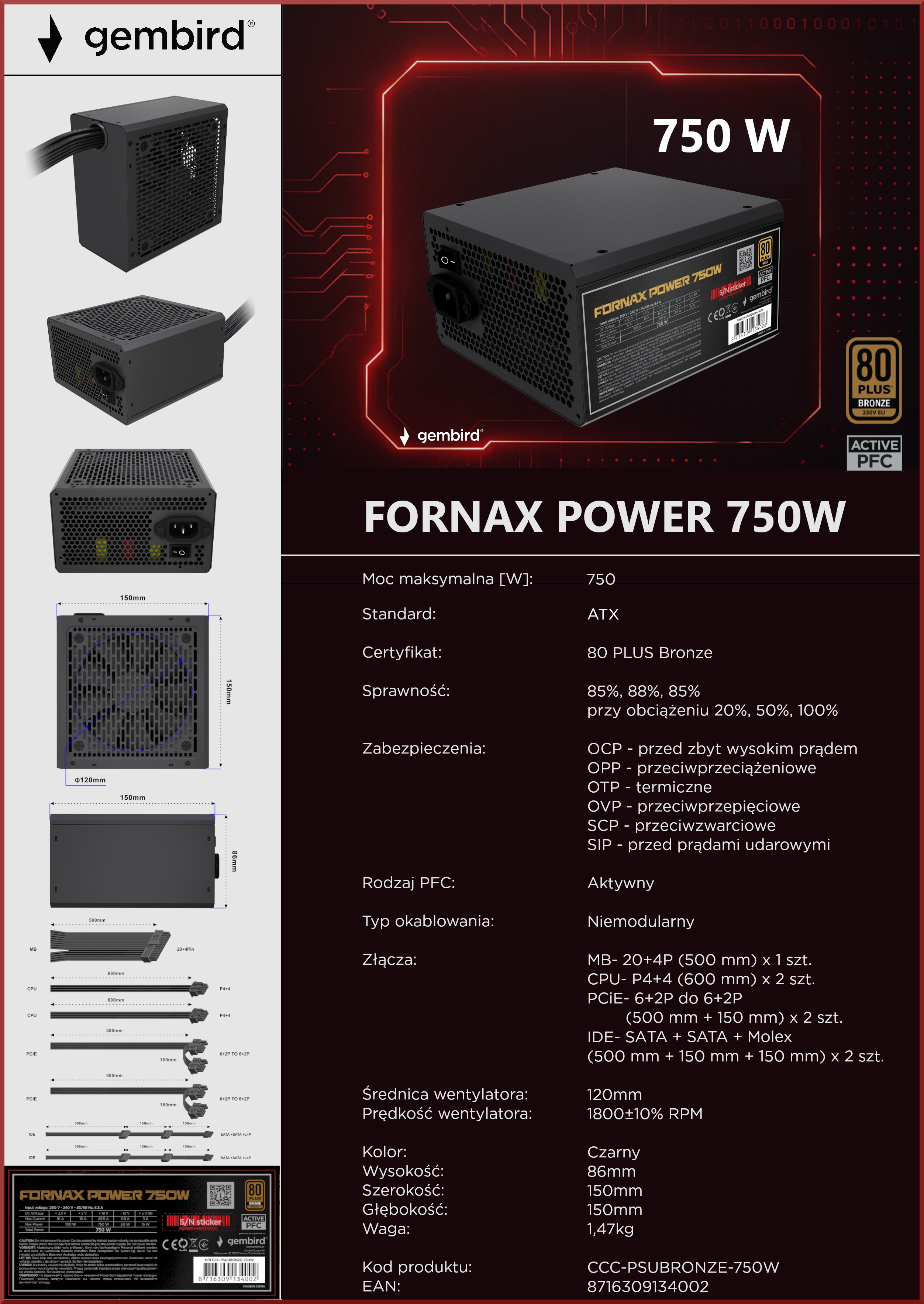 Gembird Zasilacz ATX 750W aktywne PFC 12 cm fan 80+Bronze color box