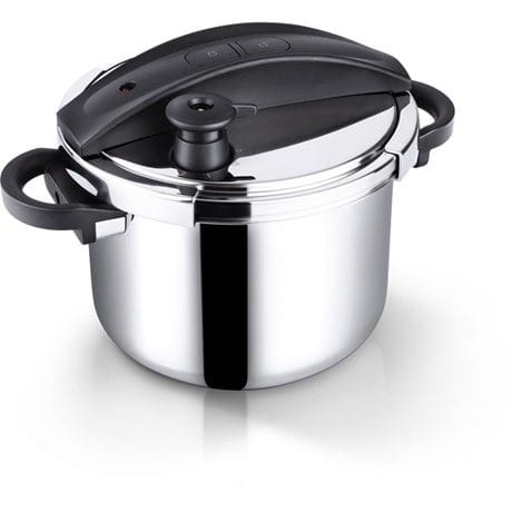 - Szybkowar wyposażony jest w manometr, zawór bezpieczeństwa, zawór bezpieczeństwa kontrolujący nadciśnienie i masywne uchwyty ułatwiające obsługę i zapobiegające oparzeniu